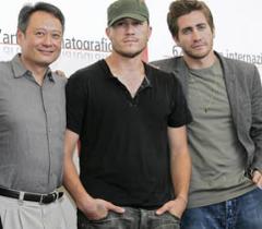 Director Ang Lee on the set of Brokeback Mountain, at Venice Film Festival with stars Heath Ledger and Jake Gyllenhaal and