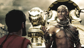 The arrival of Xerxes the self-proclaimed God (Rodrigo Santoro) of the Persians kicks the movie into hyper homo drive. Standing at